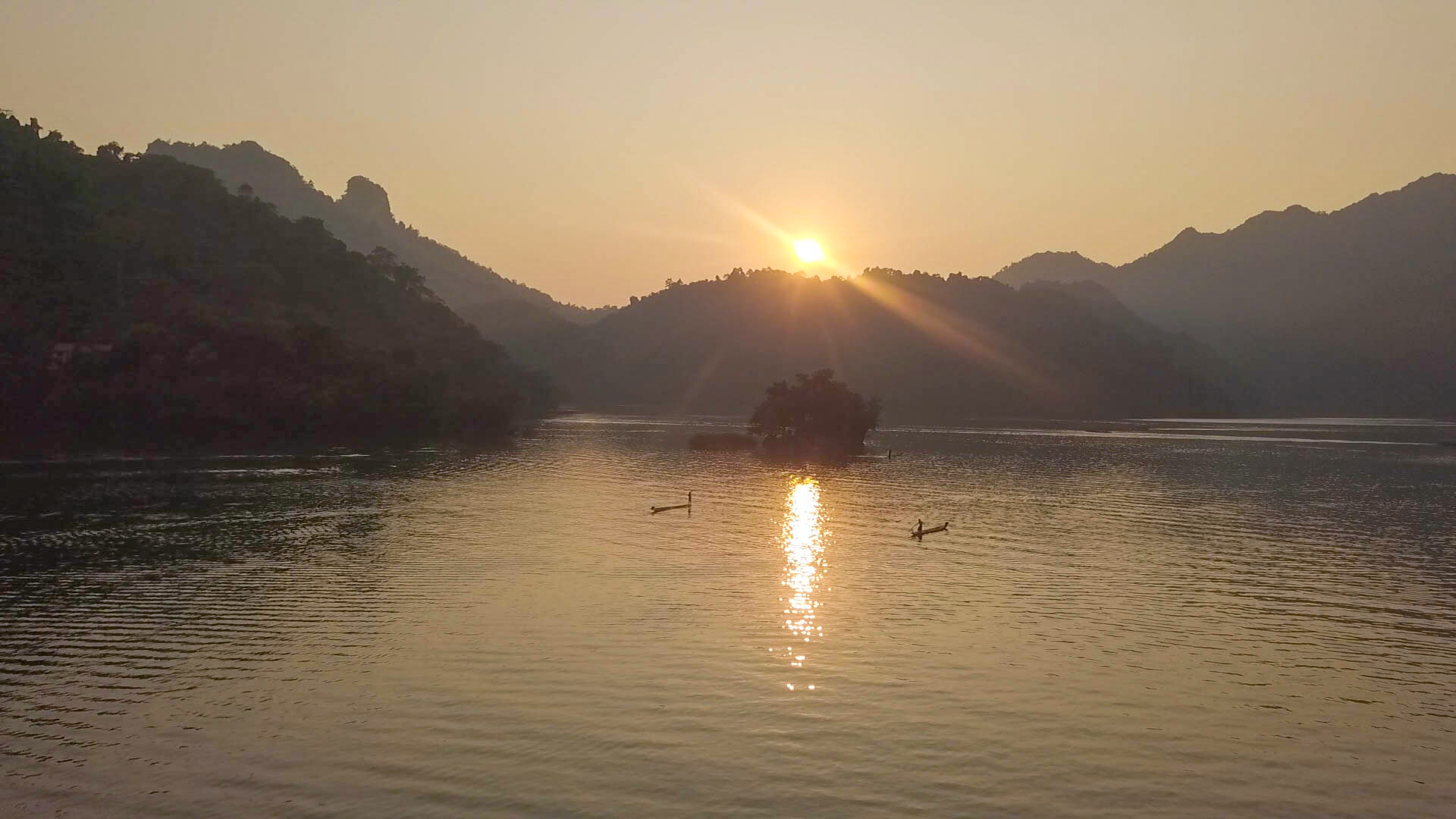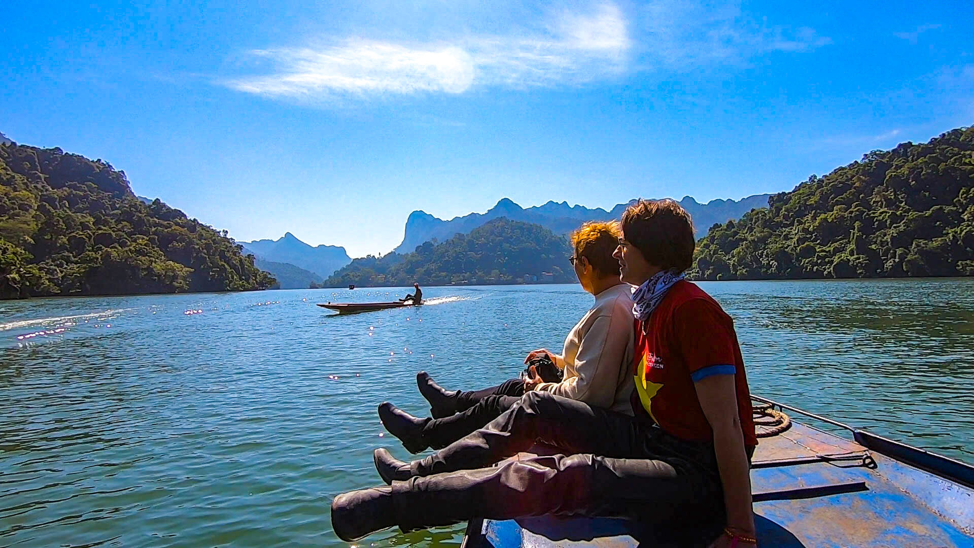 L’arrivée au lac de Ba Be, souvent en fin d’après-midi, marque une pause bienvenue. Les motos s’arrêtent au bord de l’eau, dans un décor paisible où les montagnes se reflètent dans le miroir du lac.